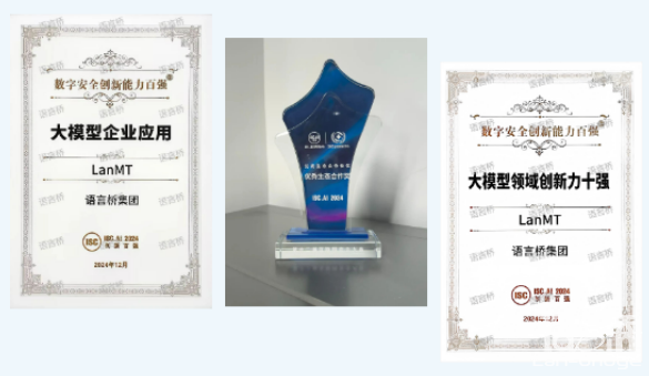 本屆創(chuàng)新百?gòu)?qiáng)由|SC平臺(tái)、大模型產(chǎn)業(yè)聯(lián)盟主辦,眾多政府單位領(lǐng)導(dǎo)、高校教育代表、行業(yè)專家學(xué)者、投融資機(jī)構(gòu)代表、標(biāo)桿企業(yè)代表等蒞臨現(xiàn)場(chǎng),基于數(shù)字化創(chuàng)新浪朝下的技術(shù)發(fā)展趨勢(shì)、典型成果應(yīng)用、科教融匯實(shí)踐等話題進(jìn)行深入探討,并共同見證了新一屆創(chuàng)新百?gòu)?qiáng)企業(yè)的震撼出爐,擎畫創(chuàng)新能力全景圖譜。語言橋集團(tuán)憑借自研核心產(chǎn)品LanMT Al翻譯模型(點(diǎn)擊文末"閱讀原文"體驗(yàn))在數(shù)字安全與A大模型兩大領(lǐng)域13大熱點(diǎn)賽道的近500家獲獎(jiǎng)廠商中脫穎而出,榮獲“數(shù)字安全領(lǐng)域創(chuàng)新力十強(qiáng)”與“A大模型領(lǐng)域創(chuàng)新力十強(qiáng)”,以及360數(shù)字安全“優(yōu)秀生態(tài)合作獎(jiǎng)”。